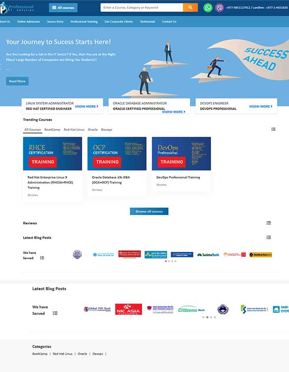Shubham Tech has developed and maintains the website www.professionalitsolution.com for Professional IT Solution, a leading IT training center in Nepal. Since March 20, 2011, this platform has been instrumental in facilitating online IT training and professional growth for IT learners. Professional IT Solution is an authorized Red Hat Training Partner in Nepal and has been delivering world-class IT training for over a decade. The center has an excellent track record of helping students achieve global certifications and secure jobs in both national and international companies. Nearly 100% of students who have taken certification exams have successfully passed, with most securing job placements. The training programs specialize in: Linux Server Administration DevOps Oracle Database Administration VMware Datacenter Administration Ansible Automation OpenStack Cloud Shubham Tech’s role is focused on providing a reliable and efficient digital platform for Professional IT Solution to deliver high-quality training, supporting individuals in building successful IT careers.